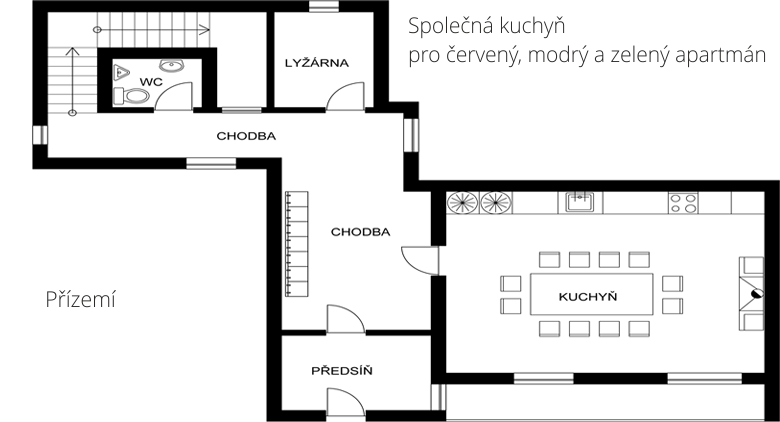 Pro každý apartmán A, B, C jsou dvě skříňky s nádobím (standardní kuchyňské vybavení).