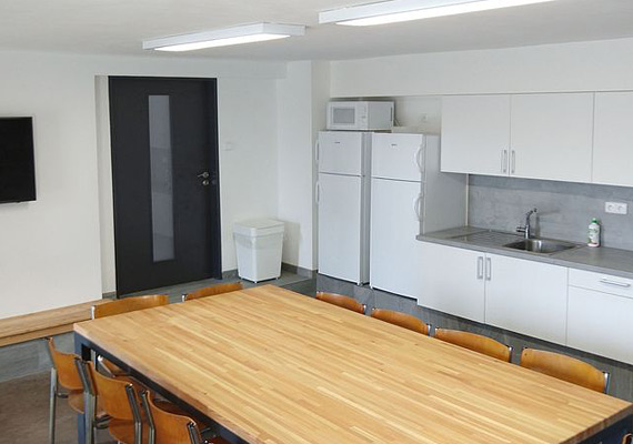 Kuchyňská linka: 2x lednice s mrazákem, 1x dřez, 1x mikrovlnná trouba, 2x varná konvice, varná deska (indukční 4 plotýnky), velká remoska.