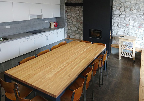 Velký stůl, 12 židlí. Televize se set-top boxem, posezení u krbu.